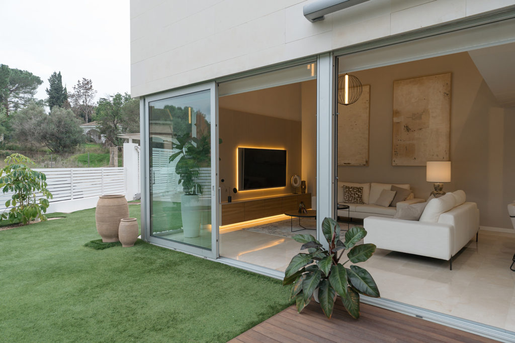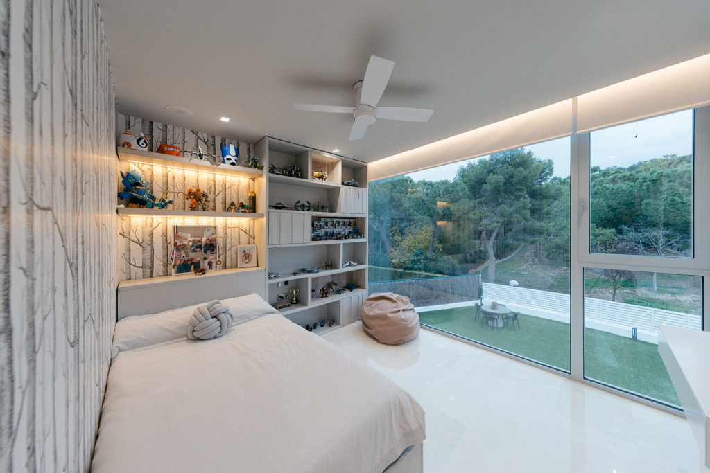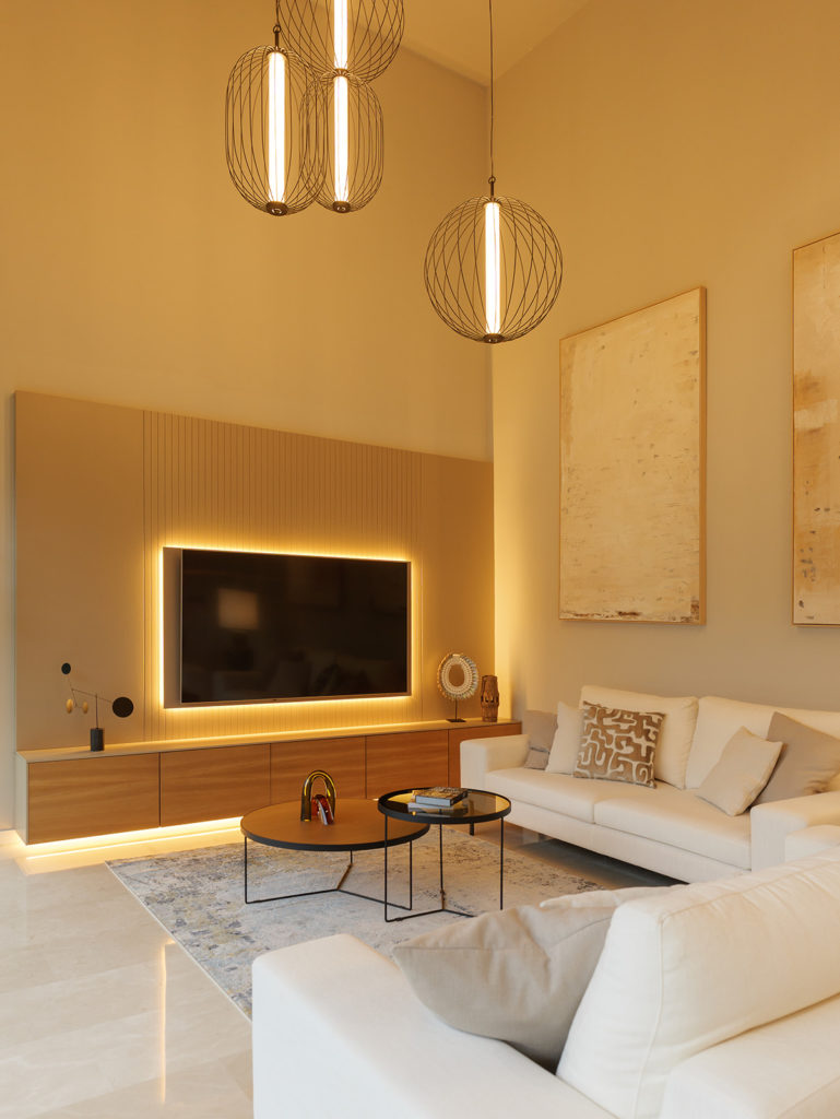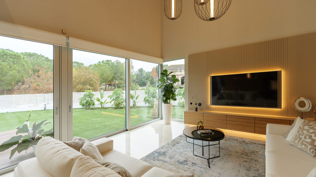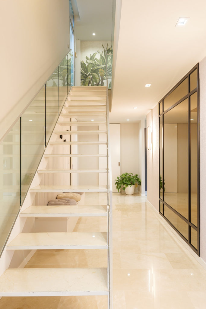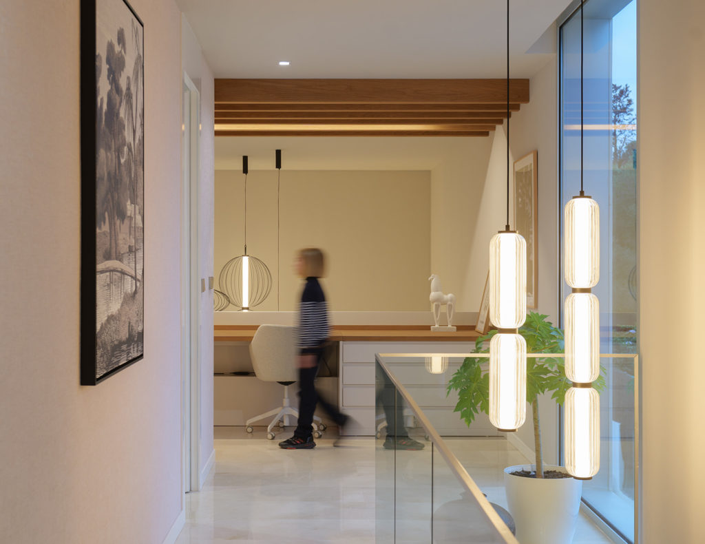 La intervención incluyó el diseño de la entrada, el salón, la cocina, el despacho y las habitaciones. Prestamos especial atención al aprovechamiento de la doble altura de la vivienda, una característica arquitectónica que nos permitió reforzar la sensación de amplitud y la continuidad visual. El resultado es una distribución de espacios fluida, donde cada estancia se conecta de forma natural.