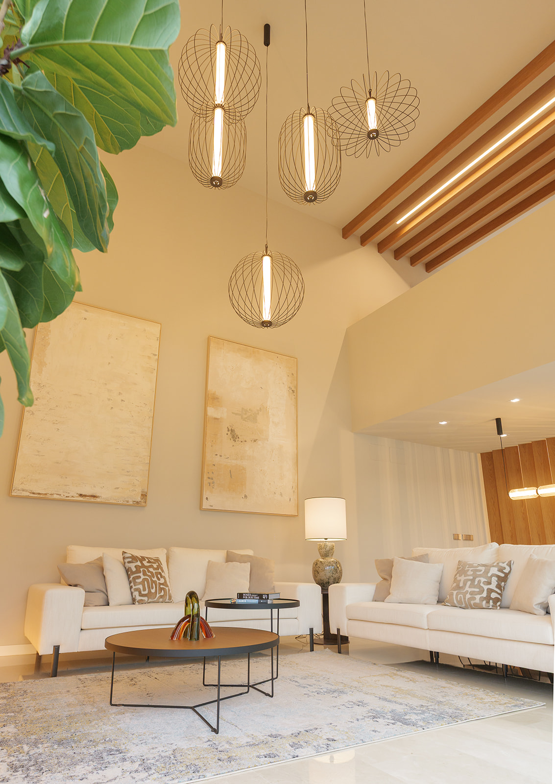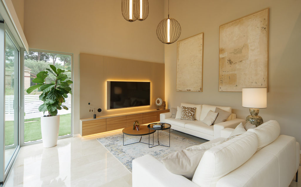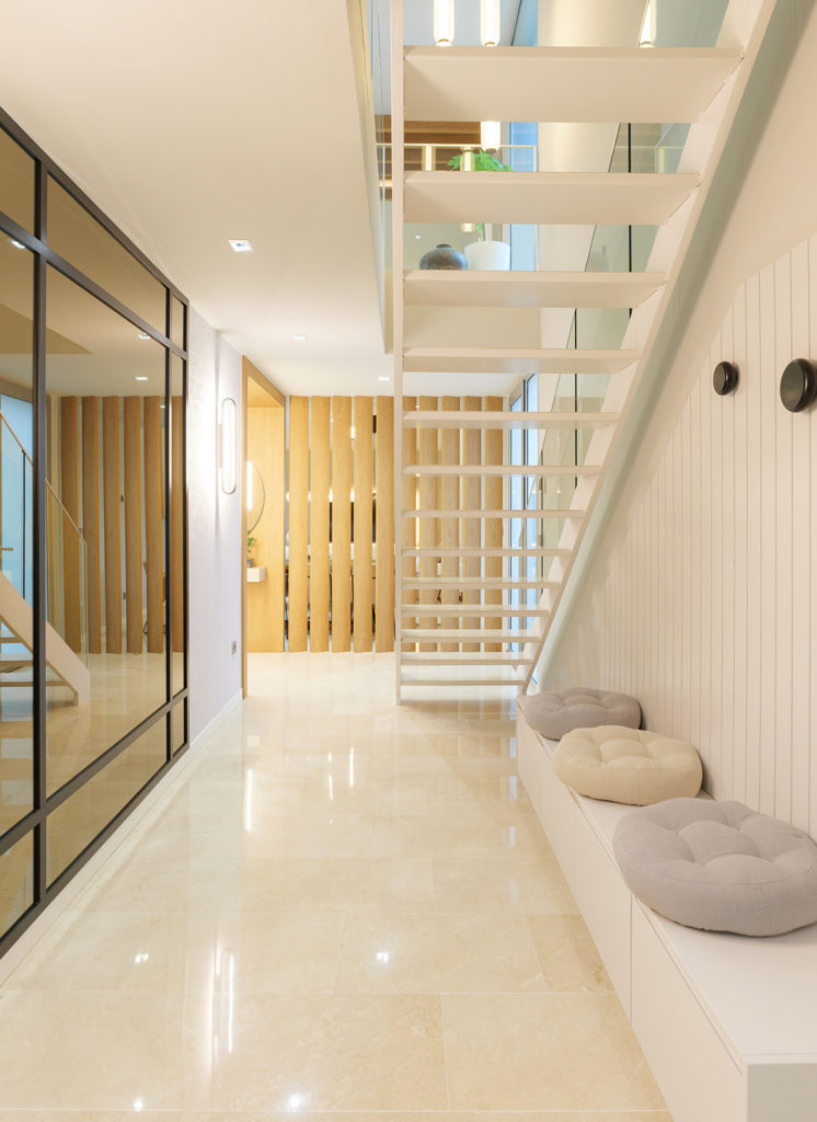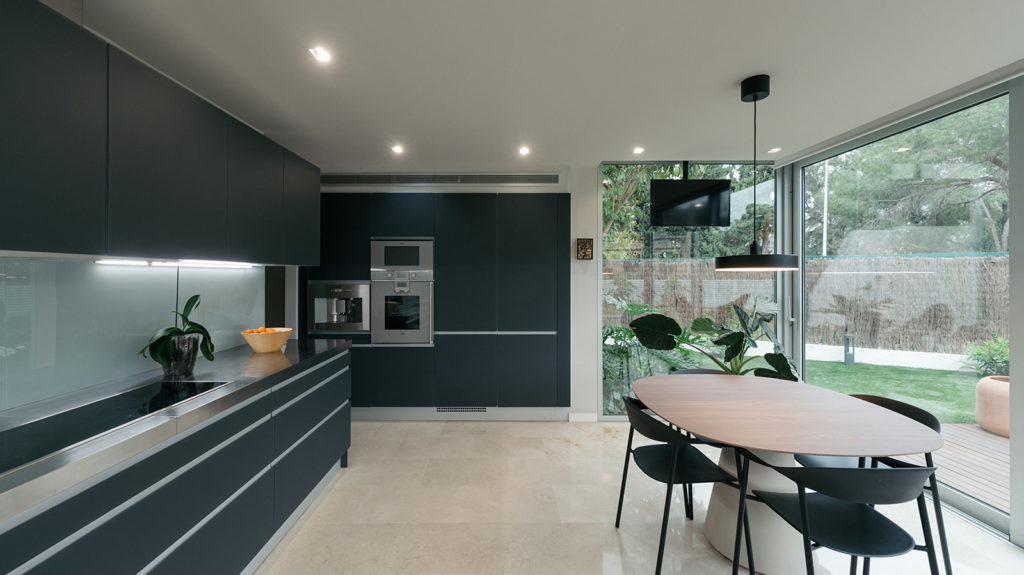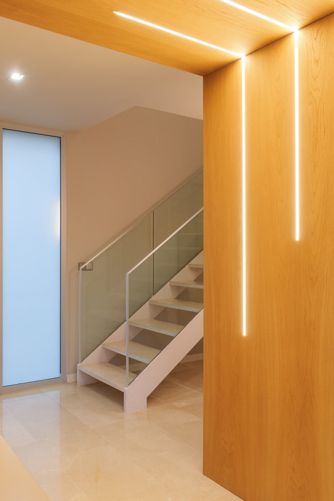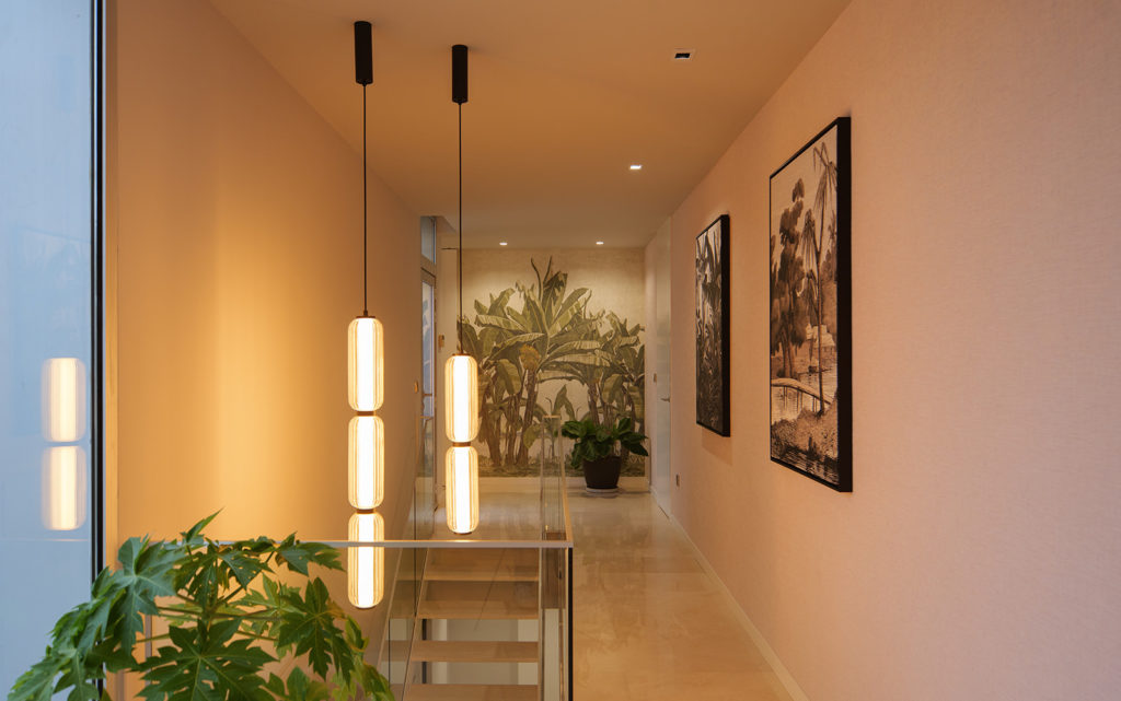 La intervención incluyó el diseño de la entrada, el salón, la cocina, el despacho y las habitaciones. Prestamos especial atención al aprovechamiento de la doble altura de la vivienda, una característica arquitectónica que nos permitió reforzar la sensación de amplitud y la continuidad visual. El resultado es una distribución de espacios fluida, donde cada estancia se conecta de forma natural.